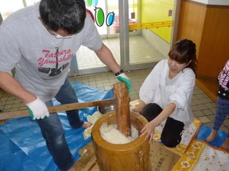 先生の振り上げる杵に合わせて、“ヨイショ!!”“ヨイショ!!”子どもたちも声を合わせて…次第にお餅がつけてきました。