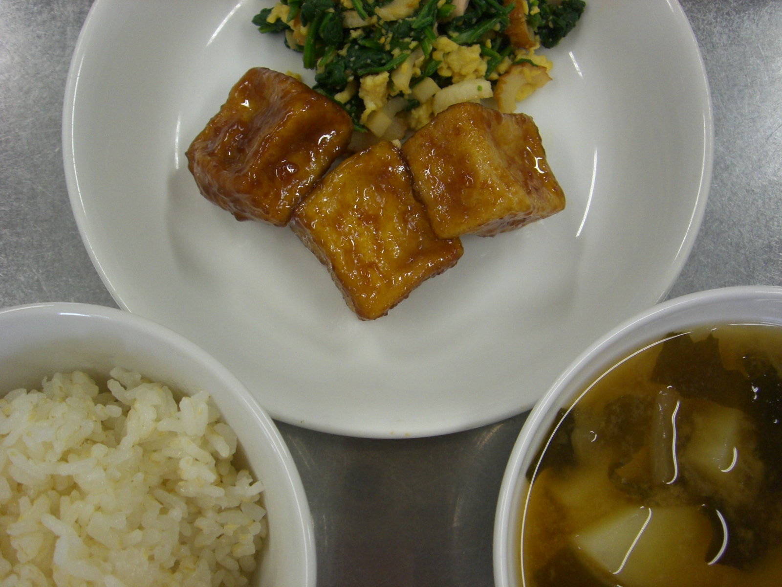 保育園では、ほうれん草のいり玉子和えを付け合せています。汁気が少ないのでお弁当の一品にもいいですね。